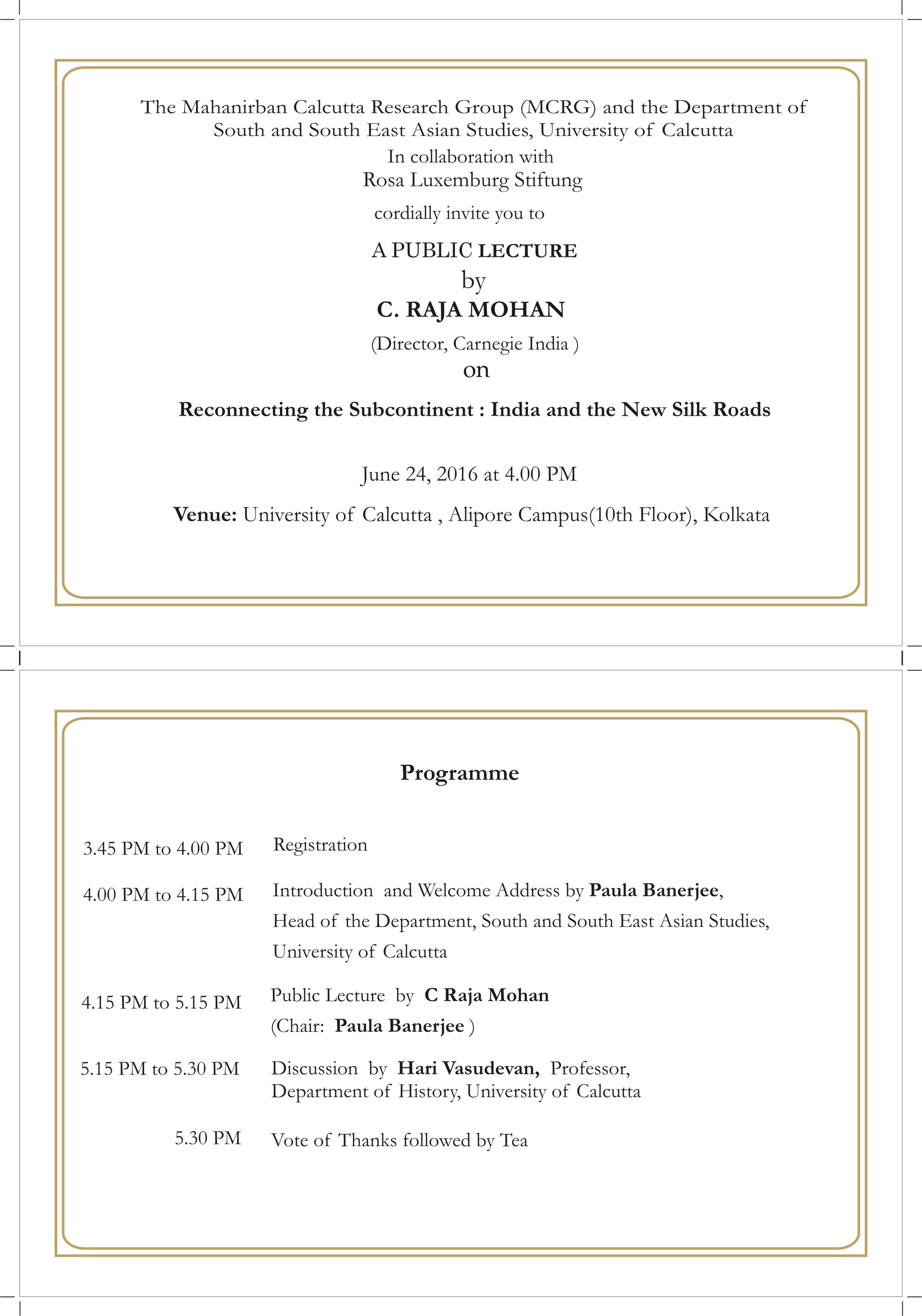 Research Workshop in Kolkata on A Social Mapping of Infrastructure Logistics, and India's Look East Policy, 16 November 2016 Public Lecture by Nimmi Kurian, Associate Professor, Centre for Policy Research on November 16, 2016 (Discussion) Research Workshop in Kolkata on A Social Mapping of Infrastructure Logistics, and India's Look East Policy, 31 August- 1 September 2016 Public Lecture by C Raja Mohan, Director, Carnegie India on June 24, 2016 (Discussion) Consultation Meeting in Kolkata on A Social Mapping of Infrastructure Logistics, and India's Look East Policy, 29 February 2016