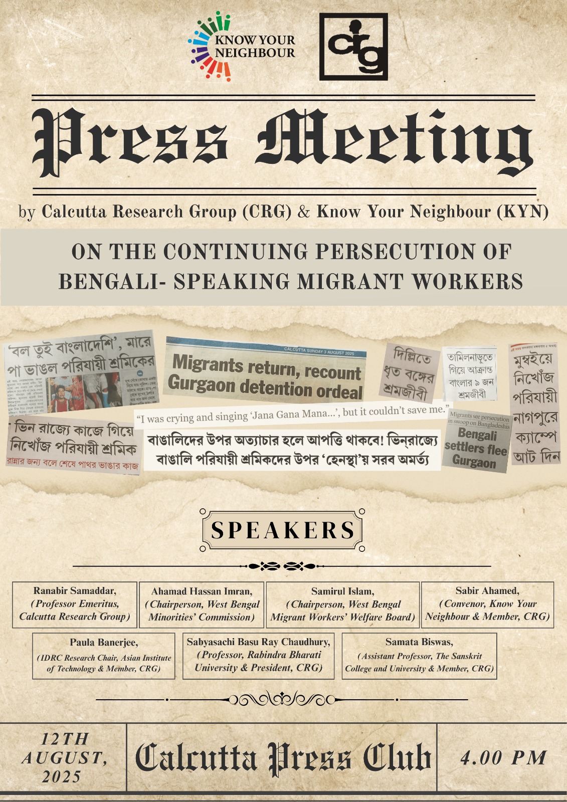 A Media Meet on Continuing Persecution of Bengali Migrant Workers was organised by the Calcutta Research Group on, 12.08.2025, Venue: Press Club, Kolkata